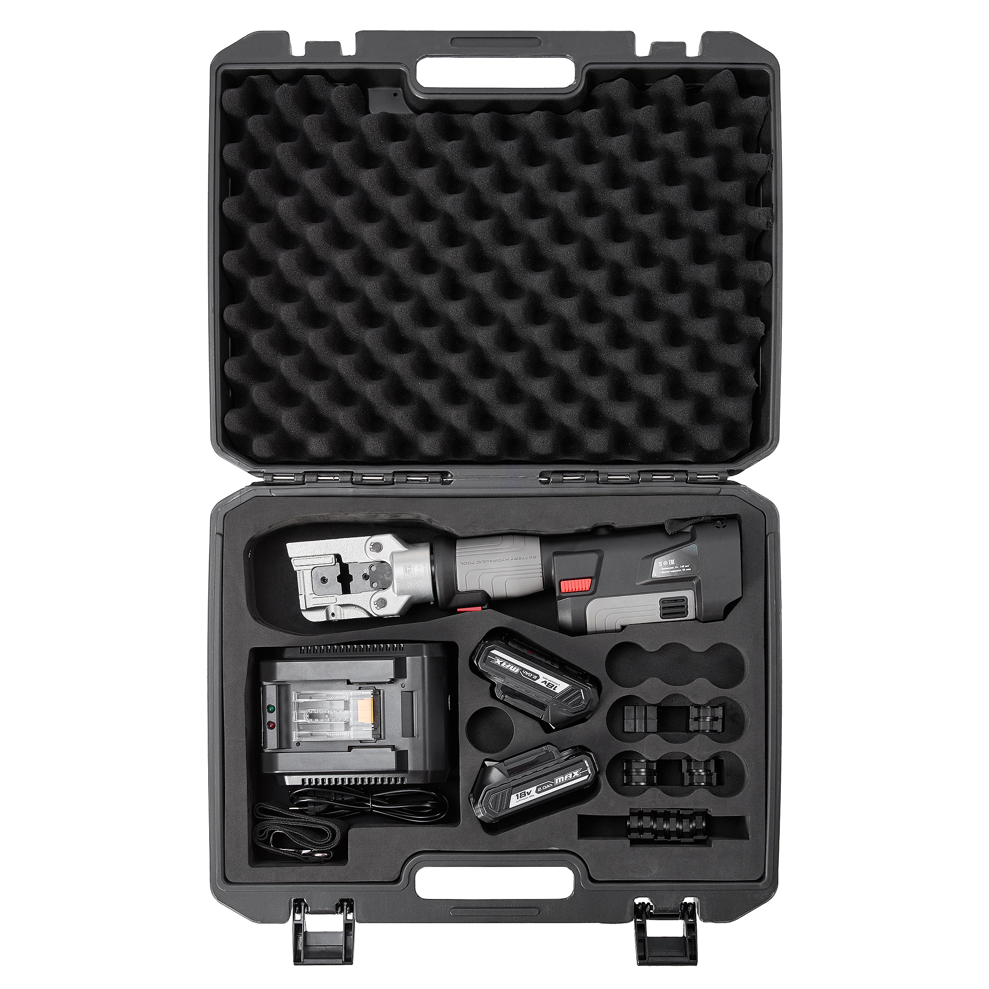 Комплект поставки: аккумуляторный пресс, набор из 10 сменных матриц, 2 аккумулятора Li-ion 18В/2,0Ач, зарядное устройство от сети 100В-240В/50Гц-60Гц, ремкомплект, прочный пластиковый кейс с отсеками для инструмента аккумуляторов и зарядного устройства